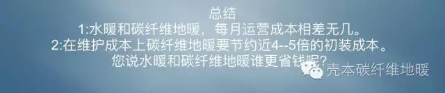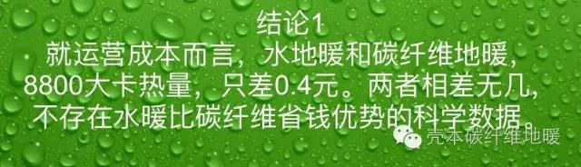 結論1:就運營成本上水暖和碳纖維地暖,8800大卡熱量,只差0.4元。兩者相差無幾。不存在水暖比碳纖維地暖省錢的科學數據。